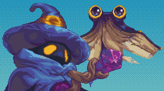 Every sprite, tileset, and visual effect was hand-crafted in Aseprite. The Wizard character alone went through hundreds of iterations, each pixel tuned to convey wisdom, mystery, and power. His familiar Tomey, a sentient tome, needed a character of its own: not just an accessory, but a companion whose positioning and expressions conveyed a bond with the Wizard.